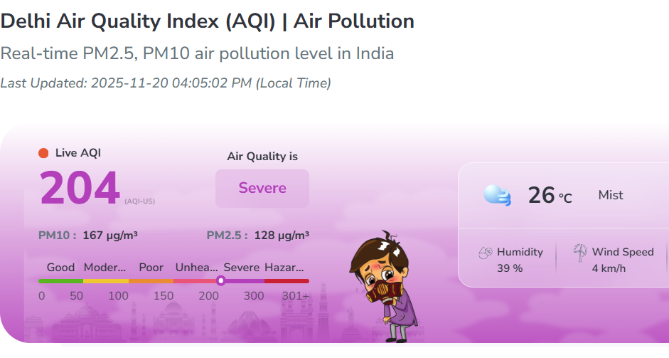 As of November 20, 2025, Delhi’s Air Quality Index (AQI) is in the “very poor” category, with an average of around 399, and several areas have slipped into the “severe” zone. The air quality has deteriorated due to stagnant atmospheric conditions and accumulated pollutants.